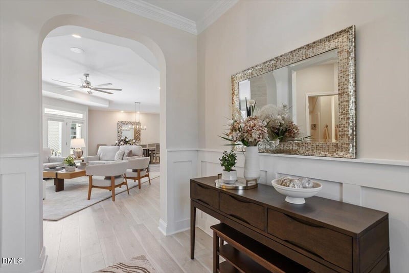 Listing details for 1812 Pinecliff Ct, Fuquay Varina, NC 27526 : Step into easy living & luxury in this thoughtfully upgraded ranch home in Fuquay-Varina's Highridge community. This single-level floor plan was built in 2022 and upgraded from top to bottom. Lives like a 3 bedroom home or 2 bedrooms + flexroom/office/craftroom. The open living area features abundant natural light, upgraded trim, and wide-plank LVP floors throughout. A chef's kitchen with quartz counters, designer backsplash, under-cabinet lighting, and a large island flows seamlessly into the dining and living spaces. The custom backlit gas fireplace is a striking focal point, while motorized blinds and upgraded lighting add everyday convenience. The primary suite offers a spa-like zero-entry shower, walk-in closet, and direct access to the private courtyard patio. Outdoor living shines with an extended epoxied patio, pergola, privacy fence, and wooded buffer. Additional highlights include a fully finished laundry with cabinetry and sink, ceiling fans, and an epoxied garage floor.