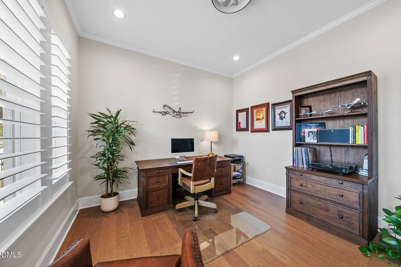Listing details for 1825 Prucha Pl, Apex, NC 27523 : This sophisticated executive home in Autumnwood North offers both elegance and functionality in one of the most sought-after locations in the Triangle. The American Tobacco Trail is right across the street! A large front porch offers a warm welcome into a thoughtfully designed home. Professionals will appreciate a private office with plantation shutters and hardwood floors. Also on the main level are a guest bedroom and full bath, a drop zone with built-ins at the garage entry, a separate dining room with wainscoting, a gourmet kitchen featuring a large island and quartz countertops. You'll have plenty of kitchen storage with both a walk-in pantry and a butler's pantry. Enjoy your morning coffee in the breakfast nook overlooking the backyard and woods. A large family room with a fireplace is inviting for everyone. Hardwoods and electric window shades elevate the space. A large screened porch is perched above an extended patio and fenced backyard. Perfect for North Carolina evenings! On the second level, the primary bedroom, also with hardwood floors, has an ensuite and a large walk-in closet with built-in shelving and organization. Two additional bedrooms and a third full bathroom are on the second level along with a large bonus/flex room with a closet. A second large bonus/flex room is on the third level with the fourth full bathroom. Use as a theater, a home gym, a craft room. An unfinished attic space offers an abundance of storage. Please see the floorplan and the feature sheet to envision the many ways to utilize this gorgeous and expansive home.