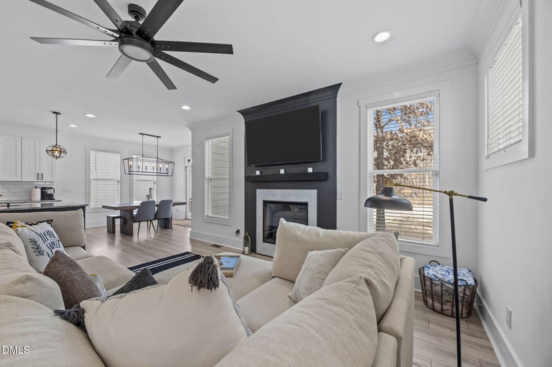 Inside you'll find luxury vinyl plank flooring that spans the open-concept first floor. The family room centers around a gas log fireplace with a custom-painted surround and mantel, flanked by windows overlooking the backyard.