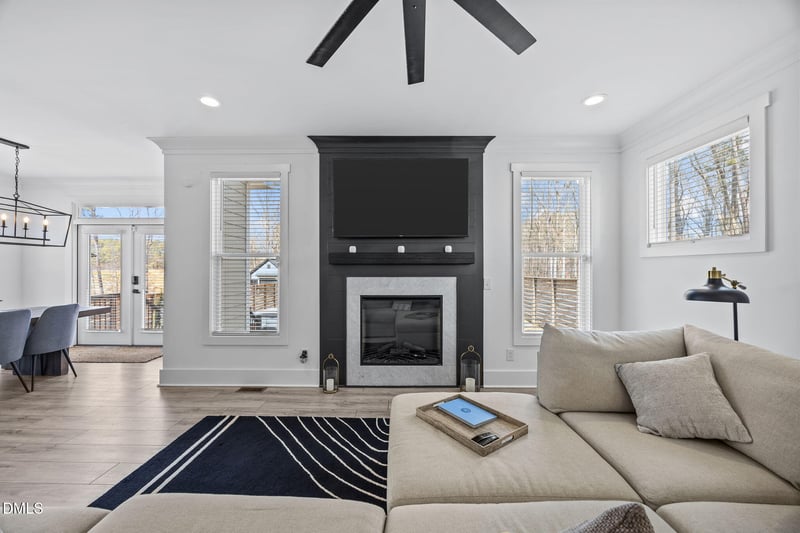 The dining area is illuminated by Restoration Hardware-inspired lighting and recessed lights, adding a designer appeal.The kitchen showcases crisp white shaker cabinets with modern black hardware, granite countertops, a white subway tile backsplash, and a large center island with barstool seating beneath three spherical pendant lights.