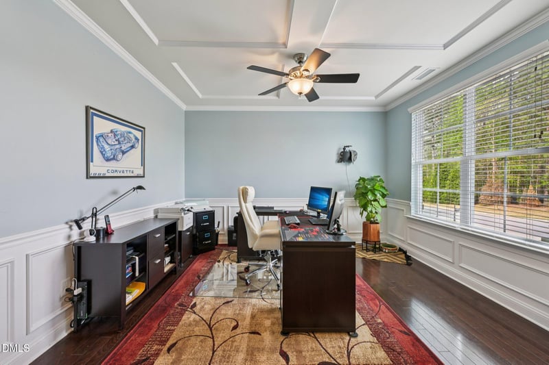 Listing details for 1959 Mostyn Ln, Apex, NC 27502 : Stunning, immaculate home in the highly desirable Salem Village community! This beautifully designed open-concept floor plan offers versatility and elegance, featuring gleaming hardwood floors in the main living areas and abundant natural light throughout. A bright, sunlit office with coffered ceiling greets you upon entrance - providing the perfect work-from-home space. The gourmet kitchen is a true centerpiece, complete with a spacious pantry, double oven, tile backsplash, ample workspace, and a large island with bar area that seamlessly flows into the dining area and inviting family room with a cozy gas log fireplace. The main-level owner's retreat is a private haven, showcasing a coffered ceiling, an expansive walk-in closet with custom built-ins, and a luxurious en-suite bath with dual vanities, tub, and separate shower with bench. The main level is rounded out by a well-appointed laundry room with built-in shelving and bench. Upstairs, you'll find a spacious loft currently set up as a home theater, extra storage, two additional bedrooms, and a full bathroom--ideal for guests or flexible living needs. Enjoy peaceful outdoor living on the screened porch with EZ Breeze windows for extended three-season enjoyment, plus a patio overlooking a large, flat, wooded backyard. Energy-efficient solar panels help reduce utility costs. HOA-maintained lawn care adds ease, while community amenities include a pool and clubhouse for an exceptional lifestyle.