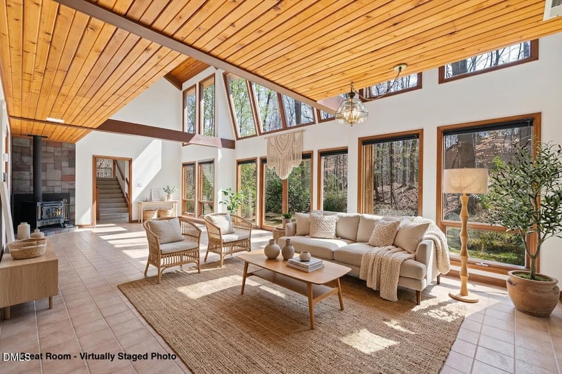 Listing details for 2012 Raccoon Rn, Clayton, NC 27527 : RARE WALDEN OPPORTUNITY! - One of a Kind, Organic Woodland Retreat! Set within 1.52 sprawling acres of hardwood forest, this architecturally distinctive deck house is designed to participate with nature, creating a home where light, landscape, and structure exist in quiet harmony. The land gently slopes to a flowing stream with a waterfall, forming a serene, Walden-like setting of wildflowers, birds, and abundant wildlife. Spanning 2,618 square feet, the home embraces its surroundings with natural materials, expansive glass, and thoughtfully oriented spaces that invite the outdoors in. At the heart of the home is a dramatic two-story great room with tile flooring and floor-to-ceiling windows that frame the forest's changing seasons. Winter sunlight fills the space while the surrounding hardwood canopy provides welcome shade in summer, creating a naturally comfortable environment year-round. Throughout the home, decks and balconies extend the living spaces outward, offering ever-changing views of woods and wildlife and reinforcing the connection between the house and its landscape. Interior features include: • Library with built-in shelving and storage • Wood-stove fireplace in the great room • Loft overlooking the great room • Three sliding glass doors opening to outdoor living spaces • Very private primary suite • Three walk-in closets • Pantry and utility room off the kitchen • Track and recessed lighting • Smooth ceilings in the library, foyer, and primary suite Additional features include: • Cedar siding exterior • Whole-house attic fan • Security system • Two storage sheds (attached and freestanding) • Paved driveway on a quiet cul-de-sac • All-electric systems The surrounding neighborhood features rustic walking trails winding through the woods, complementing the home's peaceful woodland setting. A rare opportunity to live in a home that blends architecture and landscape into a single, harmonious experience. *Some photos have been AI staged*