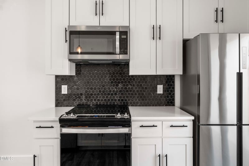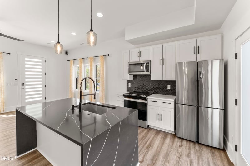 Listing details for 203 Nelson St, Durham, NC 27707 : This like-new, two-story modern contemporary home offers a perfect blend of style, comfort, and thoughtful design. Clean lines and a sleek, minimalist aesthetic create a sophisticated yet inviting space, while expansive windows and 9-foot ceilings on both floors enhance the open, airy feel. The kitchen features a stunning quartz waterfall island, complemented by gorgeous LVP flooring throughout both levels for a seamless, modern look. The home includes 3 bedrooms and 2.5 baths, with both full bathrooms showcasing beautifully tiled floors and showers. Upstairs, the private balcony off the primary suite provides a peaceful retreat--perfect for relaxing or unwinding at the end of the day. Located just minutes from downtown Durham, you'll enjoy easy access to the American Tobacco Trail, Durham Farmers' Market, Durham Bulls, and Durham Performing Arts Center, along with top dining and entertainment options.