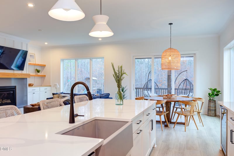 Listing details for 203 Post Oak Rd, Chapel Hill, NC 27516 : A light-filled modern retreat defined by clean architecture and intentional design, this home sits gracefully on one of the most desirable cul-de-sac lots in the neighborhood, surrounded by mature landscaping, woods, and a pond along the side boundary. The interior is anchored by a statement kitchen featuring an oversized island, tailored white shaker cabinetry, stainless steel appliances, a built-in wine refrigerator, custom range hood, open wood shelving, and an expansive walk-in pantry. Designed for seamless indoor-outdoor living, the kitchen, dining, and family spaces open through dramatic sliding glass doors to a vaulted screened porch overlooking a private backyard sanctuary. The main-level primary suite offers architectural warmth with exposed wood beams and vaulted ceilings, complemented by a spa-caliber bath with soaking tub, separate glass-enclosed shower, and an oversized double vanity. A secondary bedroom and full bath on the first floor provide flexibility for guests, while upstairs, additional bedrooms and a generous bonus room -- easily converted to a fifth bedroom -- create adaptable living spaces. Everyday function meets thoughtful design with a custom mudroom entry off the attached two-car garage, complete with built-in bench seating, cubbies for shoes, and dedicated storage for coats and backpacks. A double glass entry floods the foyer with natural light. The two walk-in attic storage areas off of second floor complete this refined yet highly livable residence. The community features a stunning pool complex complete with multiple slides and interactive water features, creating a fun and vibrant atmosphere for all ages. In addition, residents enjoy access to tennis courts, a basketball court, seven thoughtfully designed parks, miles of scenic walking and biking trails, and a beautifully appointed clubhouse that serves as a central gathering space for neighborhood events and activities. Open House 11-2 Saturday!