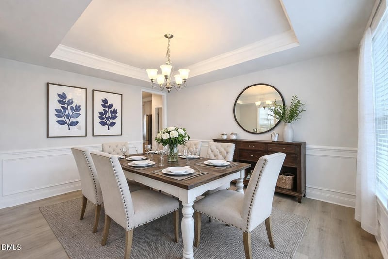 The inviting foyer opens to a bright family room with 9-ft. smooth ceilings, flush-mount lighting, and a cozy fireplace. The chef's kitchen is a showstopper, featuring granite countertops, an oversized island with pendant lighting, upgraded stainless steel appliances (including refrigerator), a huge walk-in pantry, and direct access to the covered patio—perfect for outdoor dining. Prefer indoor gatherings? The elegant dining room offers tray ceilings and wainscoting for a refined touch.