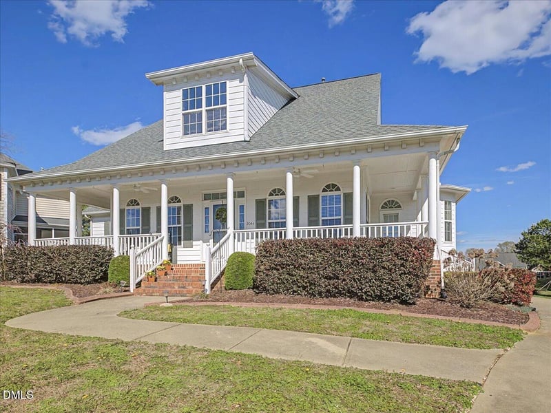Listing details for 2044 Rosebriar Ln, Fuquay Varina, NC 27526 : Welcome to this charming southern-style home that blends classic curb appeal with warm, inviting character. The property immediately catches the eye with its beautiful wrap around porch where you can relax under the stars. Walk inside to hardwood floors, separate formal dining, office, beautiful, updated kitchen with freshly painted cabinetry, subway tile backsplash, granite counters, stainless appliances including gas range, island plus desk/work station. Sunny kitchen nook leads out to wrap porch, expansive family room with french doors onto huge screen porch. Primary on main level with hardwood floors, primary bath with dual sinks, separate shower & garden tub. Upstairs 4 additional bedrooms, great closet space and updated full bath. Laundry, Mudroom space & half bath lead you into the rear entry garage. Private back yard and long driveway with stamped concrete pad.