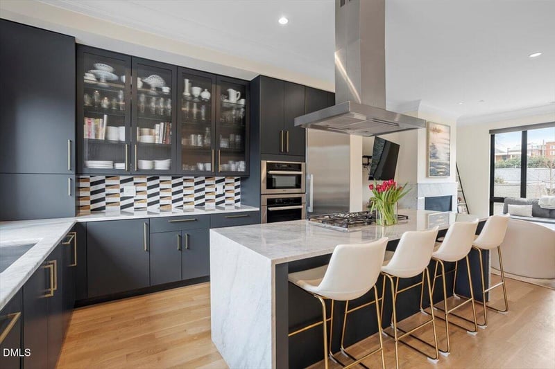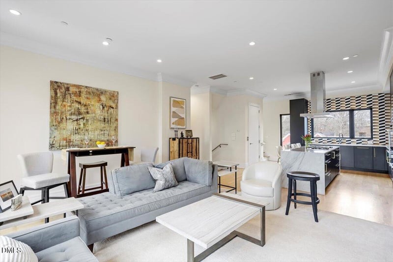 Listing details for 206 Dundas Ln, Raleigh, NC 27603 : Exquisite brownstone in Downtown Raleigh offering sophisticated design, luxurious finishes, and ELEVATOR access to all levels. Situated on a quiet side street, this stunning residence blends contemporary functionality with refined European style while delivering true urban walkability, low-maintenance living, and proximity to restaurants and downtown amenities. The ground level features a spacious flex room, access to a serene fenced-in patio, garage entry and additional storage. The second level offers two bedrooms, two full bathrooms, and a conveniently located laundry room. The main living level is designed for entertaining with premium Miele appliances, gas cooktop, double wall ovens, custom cabinetry, marble countertops, glass tile backsplash, and a dramatic island with seating. Open-concept living areas showcase white oak hardwoods, a gas fireplace, and floor-to-ceiling windows that flood the space with natural light and provide panoramic views of Raleigh. Elevator access services each level. The private owner's retreat occupies the entire top floor. The upper patio glass opens up completely for outdoor/indoor use with a den with a wet bar. Master also features spacious walk-in closet with built-ins and a spa-inspired bath complete with marble floors, soaking tub, expansive shower with rain head, and dual vanities. Luxury, location, and lifestyle all in one exceptional residence.