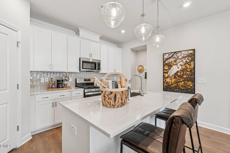 Listing details for 206 Solaire Al, Wake Forest, NC 27587 : Ready early May! Sampson plan This spacious 3-bedroom, 2.5-bath townhome features an attached 2-car garage and a bright, open first floor with kitchen, dining, and family room. The kitchen boasts upgraded Frost cabinets, quartz countertops, a large island, pantry, and brass pendant lighting, all complemented by EVP flooring throughout. The oak tread staircase leads upstairs to a versatile loft--perfect for a home office or additional entertaining space. The primary suite offers a tiled shower and large walk-in closet, while two additional bedrooms, a full bath, and laundry room complete the second floor. A convenient drop zone at the garage entry adds everyday functionality. Additional highlights include 9-ft ceilings on all floors, tankless gas water heater, Ring doorbell, Schlage smart lock, EV charging outlet, and whole-house surge protector. Enjoy resort-style living in the community with a 15-acre lake, pool, clubhouse, parks, and trails--perfect for active, connected living!