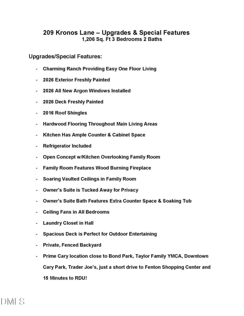 Listing details for 209 Kronos Ln, Cary, NC 27513 : Enjoy easy one-floor living in this charming ranch just 10 minutes from Downtown Cary! Perfect for first-time homebuyers or investors, this home truly checks all the boxes. Inside, hardwood floors span the main living areas and complement the open floor plan, where the kitchen overlooks the living room with vaulted ceilings and a cozy wood-burning fireplace. The private owner's suite is thoughtfully tucked away and features extra bathroom counter space and a relaxing soaking tub. All bedrooms include ceiling fans for added comfort. One bedroom offers direct access to the spacious deck, ideal for a home office or flex space. Step outside to a large deck overlooking the fully fenced backyard, perfect for entertaining, dining al fresco, or letting pets roam freely. Recent updates include fresh exterior paint 2026, all new Argon windows installed 2026, and deck freshly painted in 2026! Conveniently located and full of charm, this home is a must-see. Schedule your private showing today!