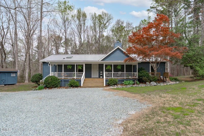 Listing details for 2090 Crawford Dairy Rd, Chapel Hill, NC 27516 : Tucked away on 3 acres along scenic Crawford Dairy Road, this home offers the kind of lifestyle that's hard to find and even harder to leave. A favorite among local cyclists for its rolling hills and quiet, less-traveled feel, the setting alone makes this opportunity special. Enjoy easy, one-level living in this true ranch home. The rocking chair front porch and the metal roof set the tone the moment you arrive. Inside, the open floor plan is anchored by vaulted ceilings in the living and dining areas, creating a bright, airy feel. The living room features a wood-burning fireplace and custom built-ins. The primary suite is spacious with a large walk-in closet and recently updated bathroom featuring dual vanities and a tiled walk-in shower. Two additional bedrooms including one with a separate entrance, ideal for guests, a home office, or a potential in-law suite. Step outside and it only gets better...beautiful screened porch offers a quiet, serene place to unwind, while the back deck and fire pit create the perfect setup for entertaining. Open and flat, the land offers room to roam, garden, or simply enjoy. Chickens are able to roam freely with a dedicated coop, and the garden produces flowers, herbs, vegetables, strawberries, and blueberries throughout the seasons. Visible stars, uninterrupted by city lights, and the Haw River is just minutes away for kayaking and exploring. Despite its peaceful surroundings, you're just 15 minutes from the restaurants, shops, and everyday conveniences of Carrboro, Chapel Hill, and Pittsboro, with easy access to Durham, Apex, and Cary.