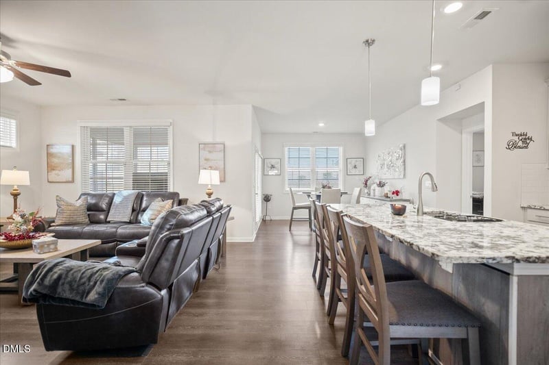 Listing details for 2131 Knight Crossing Rd, Durham, NC 27703 : This thoughtfully designed residence delivers a refined blend of modern style, intelligent layout, and everyday livability, making it an exceptional opportunity for today's buyer. The open-concept living space is intentionally designed to maximize natural light and create a seamless flow between living, dining, and kitchen areas—ideal for both relaxed daily routines and hosting memorable gatherings. The kitchen serves as a true focal point, showcasing contemporary gray cabinetry, a spacious granite-topped island for prep and seating, and abundant storage that supports both functionality and visual appeal. A dedicated dining area connects effortlessly to the kitchen, while a walk-in pantry enhances organization and efficiency, keeping the space clean and uncluttered. The main-level owner's suite is privately positioned to provide comfort and convenience, offering a well-proportioned bedroom and a spa-inspired bathroom with a walk-in shower and modern finishes designed to elevate daily routines. Durable RevWood flooring throughout the primary living areas enhances the home's aesthetic while providing long-lasting performance—perfect for busy lifestyles, pets, and entertaining. Upstairs, the layout expands with a flexible bonus room that can adapt to a variety of needs, from a home office or creative studio to a media lounge or guest retreat, alongside an additional bedroom and full bath that provide privacy and versatility for visitors or family members. Smart home technology is seamlessly integrated, offering enhanced control, efficiency, and peace of mind while supporting a modern, connected lifestyle. Equally impressive is the home's strategic location, placing you within minutes of major employment centers, dining, and cultural destinations in both Raleigh and Durham. Everyday conveniences are close at hand, with easy access to shopping, healthcare, and services, while Brier Creek's vibrant retail and restaurant scene is just a short drive away. Raleigh-Durham International Airport is also conveniently accessible, making travel simple and stress-free. This home stands out not only for its design and craftsmanship, but for the lifestyle it offers—central, connected, and effortlessly modern. Photos have been Digitally enhanced for marketing purposes.