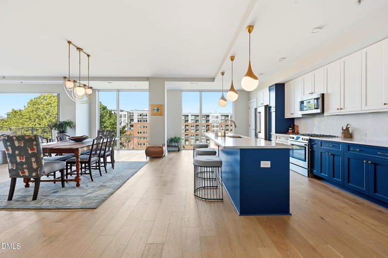 Listing details for 214 Hunt St #503, Durham, NC 27701 : This refined corner residence at The Vega offers 2016 square feet with 2 bedrooms, 2 bathrooms, and a dedicated flex space ideal for office use. The open floor plan is thoughtfully designed around the kitchen, dining, and living areas, creating a seamless setting for both everyday living and entertaining. A generous kitchen island with breakfast bar serves as a natural focal point and reinforces the home's modern, upscale aesthetic. Steel and concrete construction enhances privacy, while a wall of windows and two private balconies overlook Durham Central Park and the Farmers Market Pavilion. Built in 2023, the building features a club room, fitness center, and secure access. One assigned parking space and a storage unit convey in the covered, secure garage. Walkable to downtown dining, coffee shops, retail, and entertainment, with convenient access to transit and major employers.