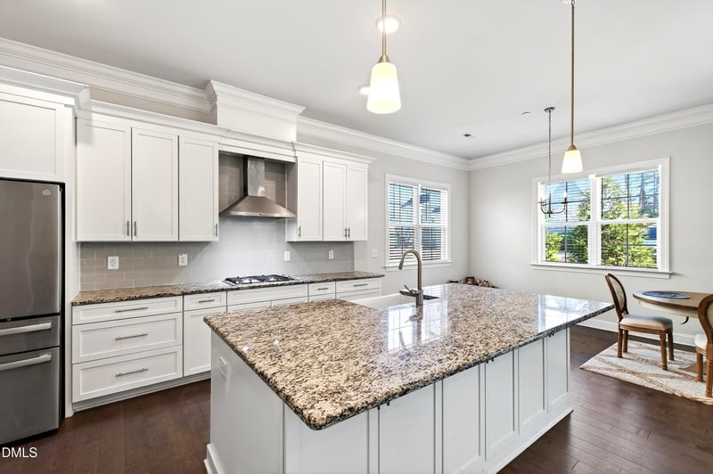Listing details for 216 Cotten Dr, Morrisville, NC 27560 : This Morrisville home offers a thoughtful layout and a location that makes daily life easier. A first floor guest or in law suite and a separate study provide flexibility for visitors, remote work, or multigenerational living. Hardwood floors run through the main living areas, setting a clean, cohesive feel. The kitchen is well laid out with granite countertops, tile backsplash, custom painted cabinets, stainless steel appliances, and a large center island with seating. A walk in pantry and an adjacent breakfast nook keep the space practical and connected. The family room includes crown molding, recessed lighting, a linear gas log fireplace, and a large sliding door that opens to the rear patio, allowing natural light and easy indoor outdoor flow. The owner's suite is positioned for privacy and features a tray ceiling, crown molding, LED lighting, and ceiling fan. The attached bath includes tile flooring, a freestanding soaking tub, a separate walk in tile shower, dual vanity with cultured marble countertops, custom cabinetry, and a generously sized walk in closet with built in shelving. Upstairs, a large open bonus room offers flexible use, along with a second study or playroom enhanced by skylights. The home is minutes from everyday conveniences including Park West Village, Trader Joe's, Wegmans, and local coffee and dining spots. Nearby access to Research Triangle Park supports a strong employment base, while neighborhood parks, trails, and community green spaces offer options for time outdoors without needing to travel far. Major roadways are close enough for easy commuting while the immediate area maintains a residential pace.