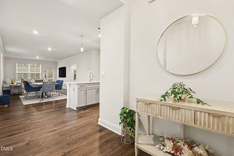 Listing details for 2307 Sugar Cone Way, Fuquay Varina, NC 27526 : Stunning end-unit townhome featuring a highly sought-after first-floor guest suite and a two-car garage. This beautifully designed two-story residence offers an open-concept layout ideal for both refined entertaining and everyday comfort. The main level showcases a spacious living area flowing seamlessly into the dining space and a gourmet kitchen appointed with white cabinetry, quartz countertops, and a designer tile backsplash.