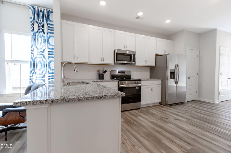 The fully upgraded kitchen is a standout, featuring granite countertops, ample prep space, 36-inch cabinetry, a farmhouse-style sink, modern pull-down faucet, and stainless steel appliances, perfect for both everyday living and entertaining. Luxury vinyl plank flooring enhances the main living areas, while plush carpeting adds comfort to the bedrooms.