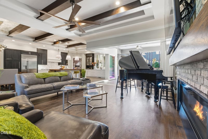 Spanning over five thousand five hundred square feet, the layout balances retreat and connection. The double-height foyer with boutique-style iron and glass doors opens into a series of integrated living zones: a chef's kitchen with reclaimed wood and quartz island, a concealed butler's pantry, and a living room where wood beams extend across the ceiling in a continuous architectural rhythm. Sliding glass walls disappear into a covered outdoor lounge--Phantom-screened and designed for all-season entertaining.