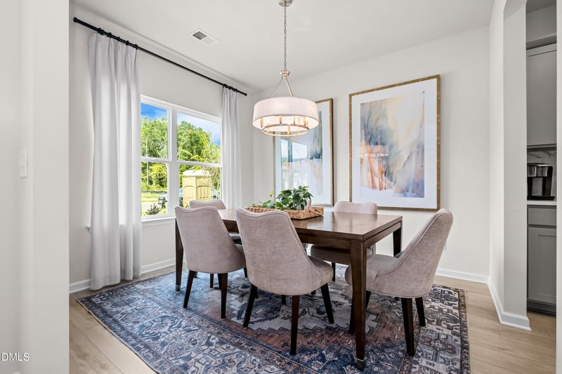 The home welcomes you with an inviting foyer that opens to a light-filled formal dining room framed by expansive windows, creating an elegant setting for both intimate dinners and lively gatherings. Just beyond, the gourmet kitchen serves as the heart of the home, featuring 42-inch stone gray cabinetry with crown molding and designer hardware, a timeless brick-lay tile backsplash, striking granite countertops, and a farmhouse sink that adds both sophistication and charm, perfectly suited for the home chef and effortless entertaining.