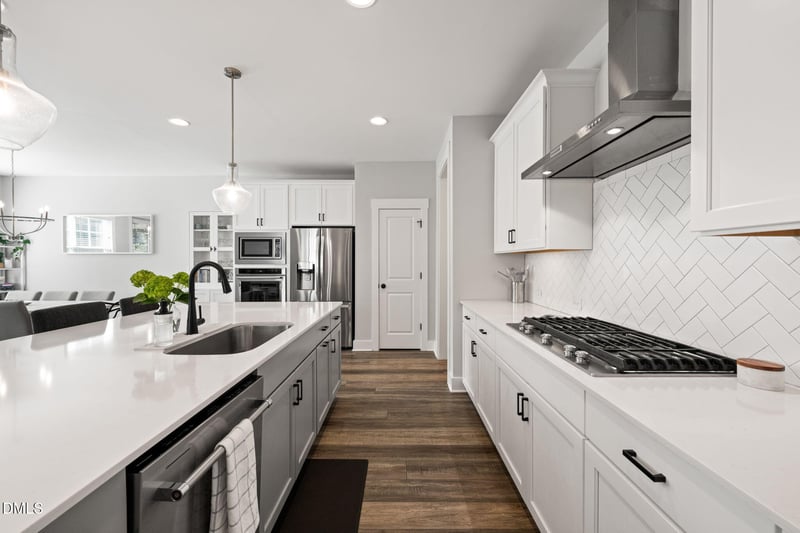 Revel in the advantages of an end townhome, where light arrives from multiple exposures, giving the interiors dimension. The main level presents as a continuous, well-resolved volume, grounded by wide-plank flooring and anchored by a kitchen island finished in quartz, with crisp cabinetry and a clean, modern palette that carries throughout. Living and dining extend to a screened porch framed by trees, carrying the living experience outward with ease.