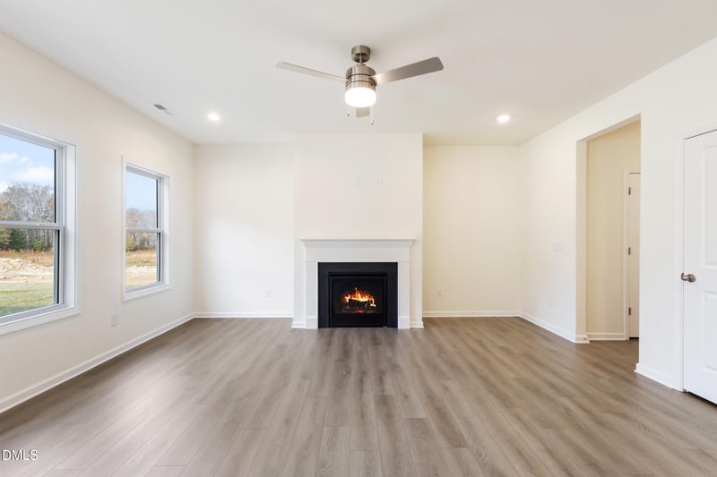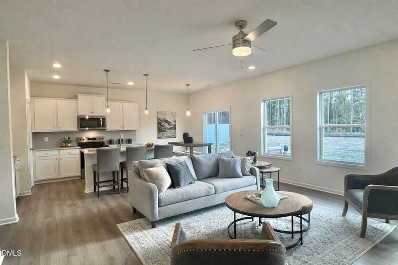The heart of the home opens seamlessly into a spacious family room--perfect for gathering, relaxing, or entertaining with ease. Just beyond, enjoy your morning coffee or unwind in the evenings on the covered patio, complete with a ceiling fan and lighting for year-round outdoor enjoyment.