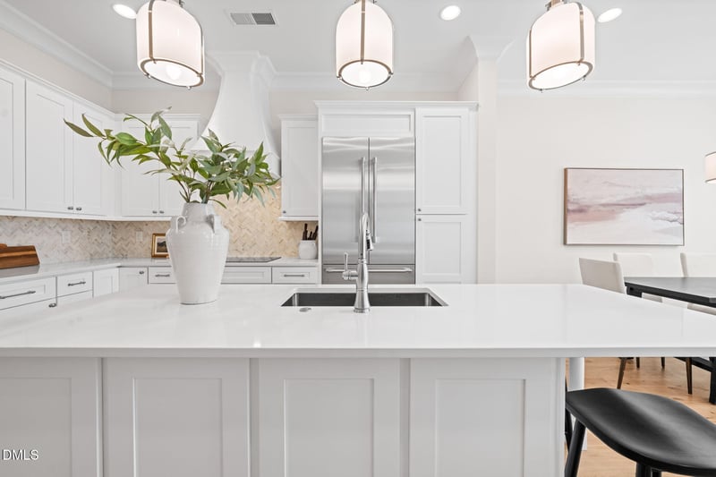 The kitchen in this specific residence has been thoughtfully elevated with Thermador appliances, including a smart WiFi-enabled induction cooktop, a custom-crafted range hood, and a striking herringbone tile backsplash. Updated designer pendant lighting and antique-finish hardware add warmth and character, blending modern performance with classic detailing.