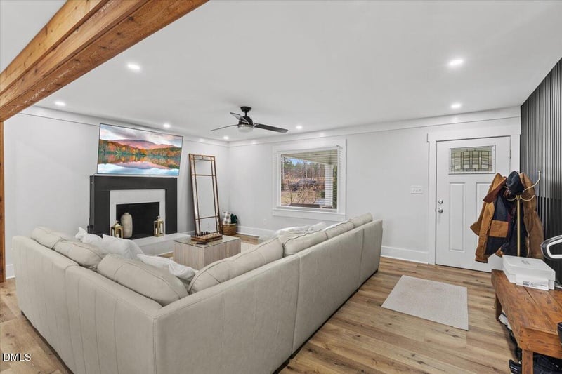 Inside, you'll find a freshly updated interior with LVP flooring (original hardwoods underneath), an open-concept layout connecting the kitchen, living room, and sunroom, and a cozy family room with a fireplace. The kitchen includes an island cooktop, pantry, and a sink overlooking a peaceful farm view, with convenient washer and dryer placement nearby and additional cabinetry for extra storage. Cedar-wrapped transitions subtly define each space while maintaining an open feel.