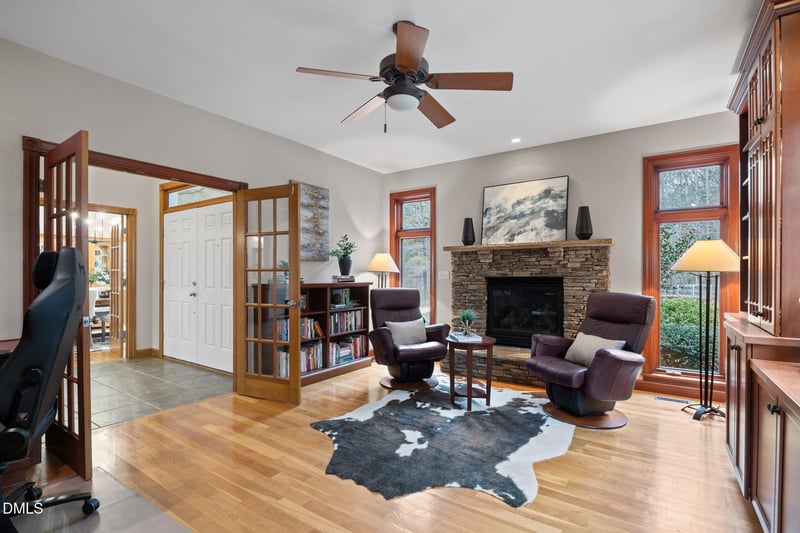 Listing details for 267 Bald Eagle Dr, Pittsboro, NC 27312 : This picturesque home sits atop a ridgeline and is privately nestled on 5.67 acres of predominantly hardwood trees, bordered by a seasonal roadside creek, and just minutes from downtown Pittsboro. Two of the 5.67 acres are fenced with three-rail wood fence and a gated asphalt driveway leads up to spacious cement parking and sidewalk. This custom-built 4,406sf home boasts 4 bedrooms, 3.5 bathrooms, including the 1,103-sf finished basement with a gym, media, and bonus room alongside 543-sf of unfinished space. The house is complete with a new roof and HVAC systems. No detail was spared in designing the entire home with both function and elegance. 267 Bald Eagle offers a quiet and harmonious blend of natural beauty with modern convenience. This home features a gorgeous formal dining room, a living room with a 2-story natural stone, wood-burning fireplace, a formal dining room, and home office with custom cherry cabinetry and a natural stone, gas log fireplace. The home's exterior features cedar shakes and natural stone are all a must-see, which are complemented by Brazilian Ipe hardwood on the rear deck. Interior highlights include oak hardwood and tile flooring, casement windows, solid wood doors and glass doors, custom natural maple cabinetry accented with under-cabinet lighting in a chef's kitchen with a high-end Wolf range, granite countertops, and stainless-steel appliances. Just off the kitchen, the spacious scullery offers a double-door pantry, housekeeping storage, cabinetry for kitchen and laundry needs, laundry appliances, countertops, a utility sink, and a bathroom. The primary suite has a vaulted ceiling, glassed-in porch, walk-in closet, and is equipped with a steam shower and jetted tub. Exterior features enhance the charm with two masonry fireplaces (wood-burning in the family room and gas logs in the office/study,) cedar shakes, natural stone, manicured landscape and lighting, an enclosed garden with a garden shed, a boat or RV barn, a treehouse, and a 6-person hot tub. Low-maintenance Brazilian Ipe hardwood accents the rear deck, the covered porch off the breakfast room, and the upstairs covered, glassed-in porch. Spectrum high-speed fiber internet is connected with incredibly fast speeds. Conveniently located, the property is a short drive to the Jordan Lake boat ramp, Robeson Creek canoe launch, and major highways, offering access to Pittsboro, Chatham Park, Apex, and Chapel Hill within 10 to 25 minutes.