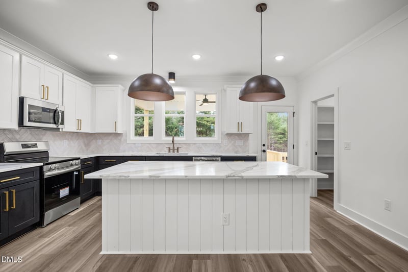 Listing details for 30 Vino Trl, Franklinton, NC 27525 : Custom build by Oaktowne Builders. POOL LOT situated in a private subdivision for immense privacy! Upgraded luxury vinyl plank flooring spans throughout the main living. Kitchen: offers ''calacatta borghini'' quartz countertops, custom two-tone accent painted cabinets with soft close, 3x12 herringbone laid tile backpslash, large center island with designer pendant lights and barstool seating, apron-front farmhouse sink, stainless steel appliances, walk-in pantry and access to the rear covered porch and grilling deck! A spacious informal dining area opens to the family room. Main level primary suite: featuers LVP flooring, custom accent trim wall, designer chandelier and en-suite bath with tile flooring, dual vanity with white quartz top and designer sconces, stained vanity cabinets with champagne bronze hardware, 12x24 tile surround walk-in shower with frameless glass, soaking tub with roman tub filler and huge walk-in closet with custom built-ins. Family room: offers a gas log fireplace wrapped in black painted chevron trim detail and topped with an oak wood beam mantle and designer ceiling fan! Upstairs features an entertainment loft, private office and spacious secondary bedrooms with optional recreational room. Huge walk-in unfinished storage area! Sealed & Conditioned Crawl Space! And so much more!
