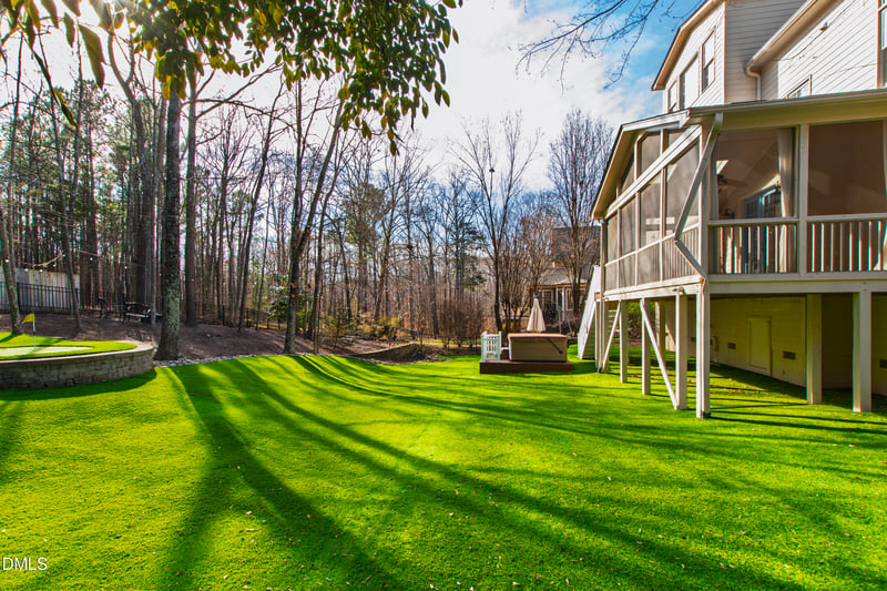 The kitchen is designed for both everyday living and entertaining, featuring a Wolf 6-burner gas range with griddle and vent hood, pot filler, farm-style sink, granite countertops, tile backsplash, and a spacious center island with a veggie sink. Recent upgrades include a new refrigerator and wine fridge in 2023. An eat-in breakfast area and built-in desk add even more versatility. A main-floor guest suite with a private full bath and walk-in tiled shower provides ideal flexibility for visitors or multi-generational living. Upstairs, the primary suite is a true retreat with a vaulted ceiling, built-in bookshelves, and his-and-her custom closets. The spa-inspired bath offers a freestanding tub, walk-in shower, double vanities, water closet, and tile flooring. Additional upstairs living includes a bedroom with en suite bath, a bonus room with hardwood floors, and two more bedrooms connected by a Jack-and-Jill bath. A convenient upstairs laundry area includes a sink and storage. Note: A main-floor mudroom offers the potential to be converted into a laundry room for added convenience. The finished third floor is a fantastic flex space—complete with a kitchenette (mini dishwasher and refrigerator), half bath, wood ceiling, hardwood floors, and generous walk-in storage—perfect for a media room, teen suite, home office, or guest retreat. Outdoor living is just as impressive, with a screened porch featuring skylights, an open deck area, and a fully fenced backyard enhanced with low-maintenance astroturf, a putting green, and a hot tub. Additional highlights include a new roof (2023), tankless water heater (2023), and a side-entry 3-car garage with epoxy flooring plus two electric car-charging ports. With its flexible floor plan, great outdoor spaces, and prime Cary location, this home manages to be both impressive and incredibly livable.