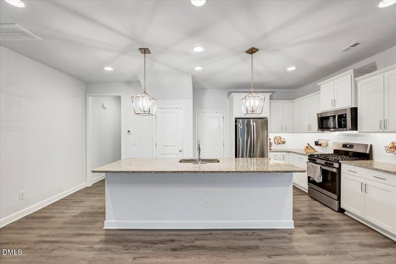 Inside, the open layout keeps everyone together. The kitchen is the hangout spot with a large center island and quartz counters, made for snacks, meals, and hosting. You can set out food on the island and still talk with everyone in the living area. Optional dining area is simple to create with a fixture, or keep it open and share food and fun times!