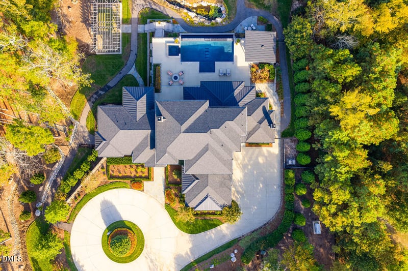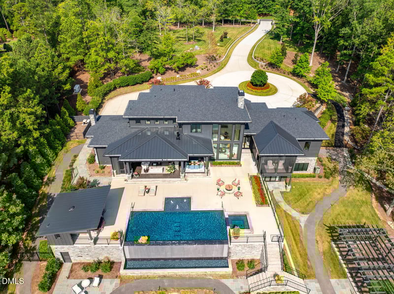 The inviting main level blends public and private spaces seamlessly. The well-appointed open kitchen adjoins delightful formal dining plus sweet gathering area and impactful island, adjacent retractable phantom heated screened porch embraces automatic year-round comfort with double fireplace combining delicious dining, 'outdoor' kitchen and luxurious lounging. The kitchen's charisma continues with fully-equipped scullery, wine frig(s), coffee bar, a marvelous mudroom close to lovely laundry, elevator serving all floors, just off the 3 car garage with super storage, EV charging & dog wash station! A perfectly placed gorgeous guest suite/den with its own entrance is a few steps from main kitchen too. A fantastic fireplace and dramatic floor to ceiling windows grace the main living room. The peaceful primary suite with screened porch access to patio and views of the saltwater pool, lake and luscious landscape is elegantly equipped with dual baths, closets, oodles of storage and a nicely appointed office/library. The serene second level blends three beautiful en suite bedrooms, laundry and open sitting area overlooking the lower levels with views of The Great Outdoors. Great Live-Work-Play planning of walk-out Lower Level sports ultimate versatility. The 7,000+- bottle wine cellar is also wired to be media room (if lots of wine isn't your cup of tea), the Workout Room with sauna could be a Workshop, the Recreation Room could be music room and the Media Room could be en suite Bedroom for caretaker, au pair, guests et al with attached golf cart garage. The Amazing Exterior and Grounds are as exceptionally curated as the Interior. The Patio stretches the entire length of the back and is perfect for enjoying splashing/relaxing in the Saltwater Infinity Pool & Spa with Sundeck + Fountains, two built-in fire pits, Dining Pavilion with Grill and Pizza Oven, Half Bath + storage. All this overlooking the Screened Garden Pergola, Paved Walking Path that meanders along beautifully landscaped grounds, rippling stream over river rocks to lily ponds on the way to the Screened Gazebo on the freshwater lake complete with Private Dock. Every detail is Inspired, Sophisticated, Curated and Friendly to Gracious Living located within walking distance to 22 mile American Tobacco Trail, across the street from world-class, private golf course, Old Chatham, Jordan Lake, 15 miles in one direction to Research Triangle Park and opposite direction to world class shopping, dining, entertainment. Central to RDU Airport, UNC, Duke, NC State, incomparable Healthcare, easy access to NC Coast, Mountains and RDU Airport.