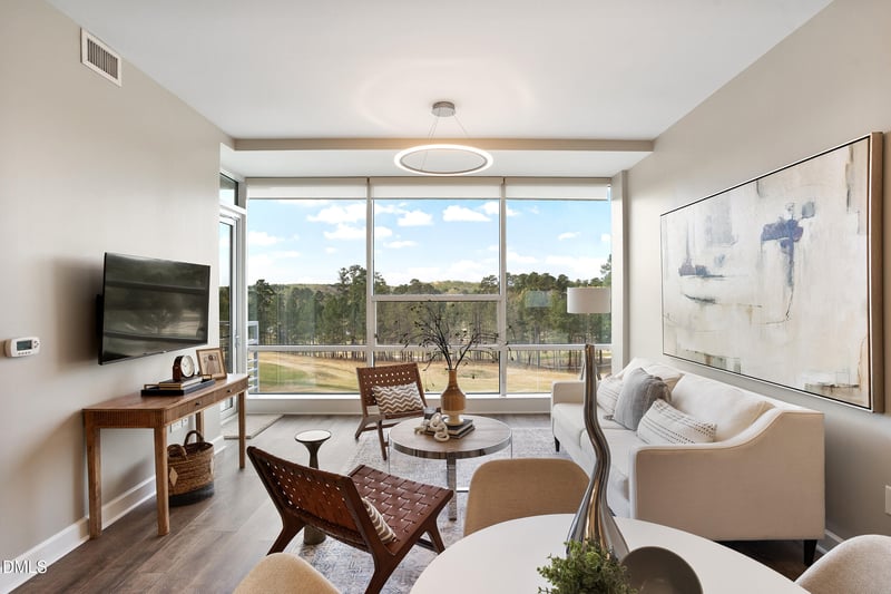 Listing details for 3406 Environ Way, Chapel Hill, NC 27517 : Enjoy effortless condo living with breathtaking, ever-changing views of Finley Golf Course. A dramatic wall of floor-to-ceiling windows fills the home with natural light and showcases the stunning scenery the moment you enter the space. The elegant, fully renovated kitchen features all the modern features and finishes buyers desire. New durable flooring and upgraded LED lighting add a fresh, sophisticated feel. The updated bathroom includes a frameless glass shower door and new tile on the shower floor, A custom closet provides exceptional organization and storage. Step outside to your private balcony--perfect for morning coffee or relaxing while watching spectacular sunsets at the end of the day. Residents enjoy outstanding amenities including a well-equipped fitness center, rooftop saltwater pool, walking trails, and a tot playground. Located in the desirable East 54 community with restaurants, retail, and transit access right at your doorstep. Just minutes to UNC (1 mile), I-40 (2.3 miles), and Fresh Market (easy stroll). Other recent upgrades include a newer HVAC (2020) and washer/dryer (2025), offering added peace of mind.