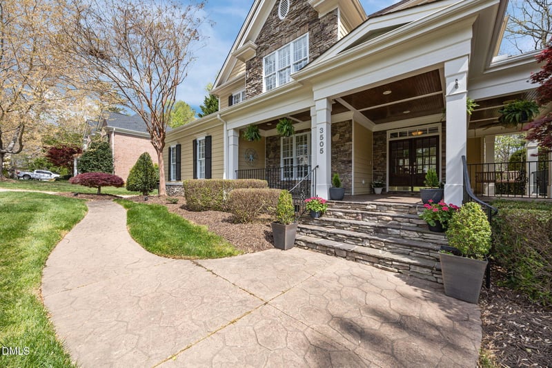Listing details for 3505 Pony Soldier Dr, Apex, NC 27539 : Tucked away on a quiet cul-de-sac in Apex, this beautifully crafted home offers a rare blend of timeless design, custom woodwork, and a private wooded setting with no rear neighbors. From the moment you arrive, the wrap-around porch and side-load garage set the tone for a home that stands apart from today's builder-grade options.