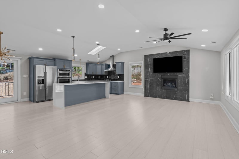 Listing details for 3513 Brook Dr, Raleigh, NC 27609 : **$15k in CLOSING COSTS with acceptable offer** Minutes to North Hills, this fully renovated contemporary ranch truly stands out. The open-concept main level features high ceilings, a spacious living room with a beautiful marbled tile fireplace, and flow into the kitchen. The kitchen is outfitted with quartz countertops, KitchenAid appliances, modern fixtures, and a stunning waterfall island that opens to both the dining and living areas. 3 bedrooms and 3 FULL bathrooms on the main level, plus a flexible additional room ideal for a formal dining space, home office, or potential 4th bedroom. The primary suite is a retreat of its own, featuring a tiled bathroom with dual vanities, a walk-in shower, and a soaking tub. The basement of your dreams offers endless possibilities: a massive rec room, secondary living room, playroom, gym, or media room, plus an additional bathroom and laundry room. Basement access is available from both the garage and interior stairs for added convenience. Private, tree-lined lot with deck and additional brick patio. Located in the Root/Oberlin/Broughton school district, this home offers city convenience with established neighborhood charm. Experience living minutes to North Hills where you can enjoy shopping, dining, trails, parks all within walking distance!