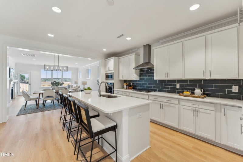 As you step into the foyer, you'll be drawn to the heart of the home: the kitchen. This central hub, featuring a large eating bar island, is equipped with a gourmet stainless steel appliance package, including a hood vent, chic white cabinetry and quartz counters. The kitchen opens up to the dining room and a bright great room, which is adorned with additional windows and a beautiful fireplace. Just off the great room, you'll find a wooden deck, ideal for extending your outdoor living space.