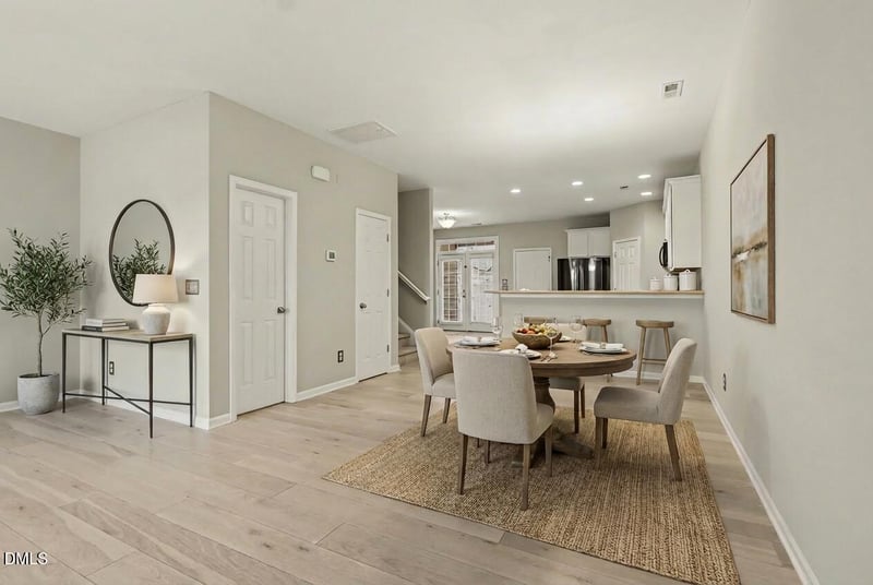 Listing details for 3634 Olympia Dr, Raleigh, NC 27603 : Light and bright 2 story townhome in desirable Renaissance Park with two primary bedrooms and one car garage! Beautiful on-trend blonde wood floors throughout main level with large living space, dining and eat-in kitchen that would make the perfect home office. Kitchen has tons of counter space, cabinet space, pantry and almost new appliances. Upstairs find a huge primary with walk in closet, soaking tub and separate shower and a second primary with ensuite separated by a large laundry room making this the perfect set up for roommates.
