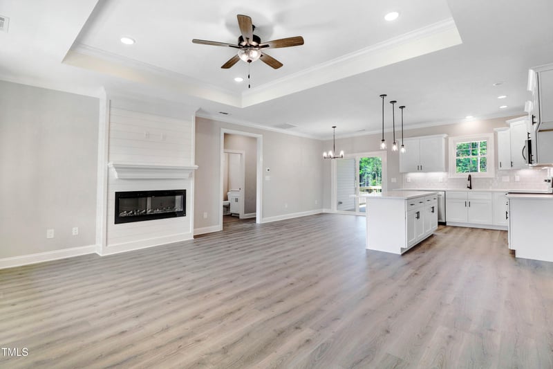 Listing details for 37 Birchtop Cir, Zebulon, NC 27597 : Welcome to this charming 3-bedroom, 2-bath home situated on a peaceful, spacious lot. The thoughtfully designed open floor plan connects the kitchen, dining, and living areas—ideal for both everyday living and entertaining. The kitchen features a large island with a breakfast bar, quartz countertops, tile backsplash, under-cabinet lighting, stainless steel appliances, and a walk-in pantry. The inviting family room offers a tray ceiling and a cozy electric fireplace. The primary suite boasts a tray ceiling, dual vanities, a beautifully tiled walk-in shower, and a large walk-in closet with custom wood shelving. Enjoy the outdoors from the covered back deck, overlooking a tranquil backyard. Don't miss your chance to see this beautiful home! Photos are from a previously built home