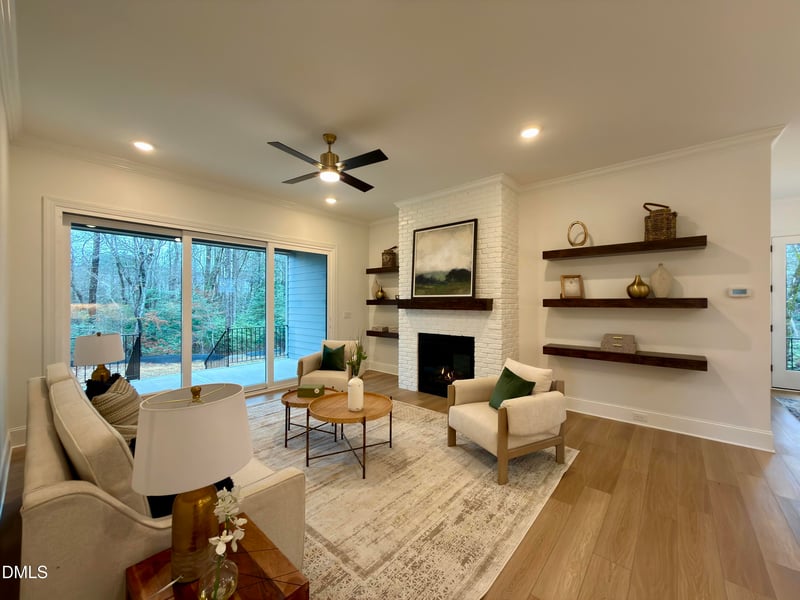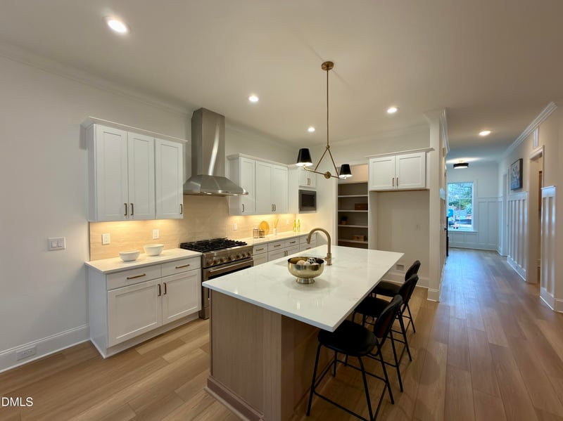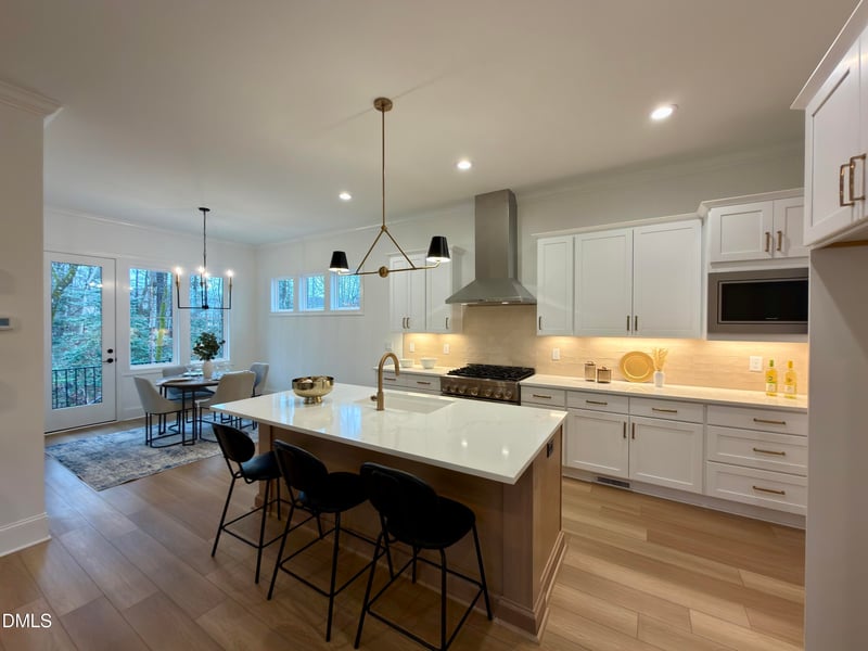 Inside, you're greeted by a bright, open living room featuring a cozy gas log fireplace that flows into the dining and kitchen areas. The dining room opens to a spacious covered patio, perfect for enjoying seamless indoor-outdoor living. The kitchen is a chef's delight, with a large quartz island with bar seating, ample wrap-around cabinetry, and a generous walk-in pantry for all your storage needs. The first floor also includes a functional mudroom with built-in cabinets for easy organization.