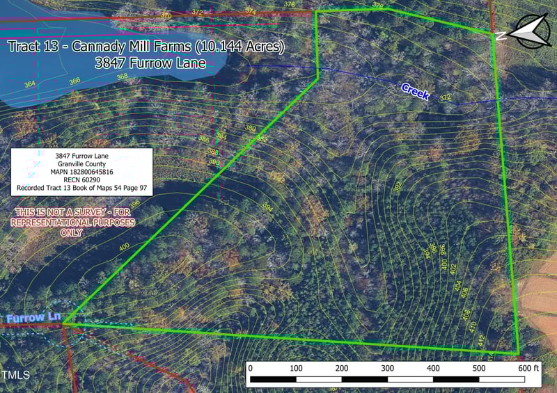 Listing details for 3847 Furrow Ln, Franklinton, NC 27525 : Beautiful 10-acre homesite with mature timber, small cleared area, rolling topography and level areas, and multiple building options—BASEMENT AND LEVEL BUILDING ENVELOPES. A flowing creek, potential pond site, and view of the neighboring pond add to the charm. Horses allowed, bring your own builder, ask for local recommendations, and no timeline to build. Mild protective covenants (No HOA) apply, along with a road maintenance agreement (Road maintenance association- Cannady Mill Farms Road Maintenance Association- $250/year). Soils evaluated by Dan Bliley (licensed soil scientist) confirm suitability for septic. Septic needed. Private well needed. Wake Electric underground power, Spectrum internet expected within 2-4 months. Peaceful rural setting, homesteading encouraged. Note one-time split allowed, must be to direct family members, ask LA for more information or see covenants/discuss with licensed surveyor and planning department. Guided tours encouraged. Additional tracts available.