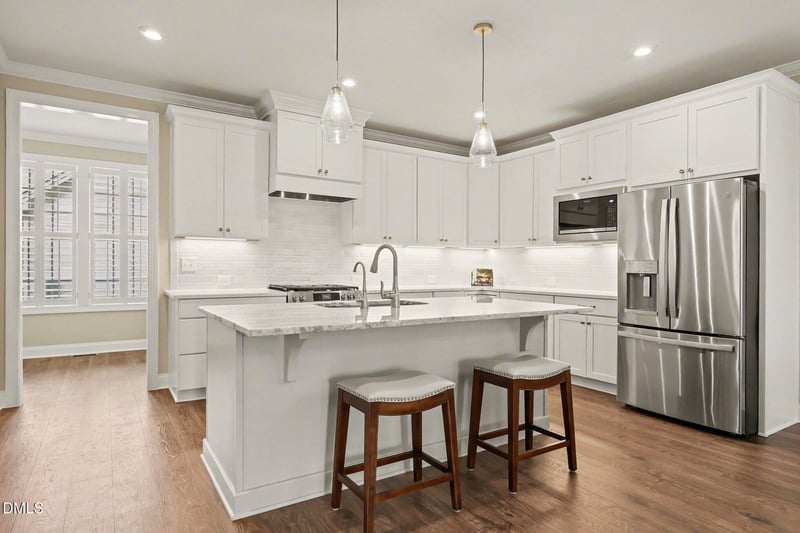The open-concept main level is a showstopper, featuring gleaming hardwoods and a chef's kitchen anchored by an oversized marble island and a premium gas range. The living room exudes warmth with a fireplace framed by custom built-in shelving, while a dedicated drop zone keeps daily life organized.