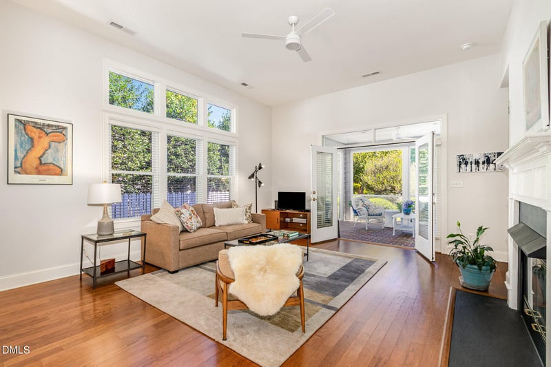 Listing details for 4 Macon , Pittsboro, NC 27312 : Nestled in Camden South, one of Fearrington Village's most desirable neighborhoods, you will find this charming home with privacy, views, and convenience! For 20 years, there have only been two owners who meticulously maintained this property. Flooded with sunlight from South, East, North, and West facing windows. The larger than usual Camden lot is a gardener's delight with lovely flowering trees; songbirds, hummingbirds, and butterflies abound. Living room with fireplace and high ceiling has French doors that open to a screened porch with a view of the manicured yard that is maintained by the HOA, and there is a peaceful view of the protected woods. Separate dining area. Hardwood flooring in living room, dining room, and kitchen. Kitchen with island has updated (2020-2024) dishwasher, refrigerator, and Thermador range. Glass doors open from the kitchen to a courtyard garden with a water feature and garden with many perennials and other unique plantings. Separate laundry room with premium LG washer and dryer, both on back-saving pedestals (new in 2020). Main-level primary suite with built-in shelving and desk. Primary bath features a tile shower with Kohler Purist plumbing fixtures and knobs/pulls. Upstairs there are two spacious bedrooms and a full bathroom. Two-car garage with built-ins. Rainbird irrigation system. Recent updates include new roof, new Berber carpet in primary bedroom and upstairs, newer water heater (2019), new toilets, Hunter Douglas Powerview electric blinds in the primary suite and kitchen, and new HVAC systems for first and second floors. Camden South is an easy walk to the Fearrington Village center featuring a gourmet café and market, a luxury inn, boutique shops, a nationally known bookstore, a bank, a beauty salon, and a spa. The excellent Farmer's Market draws shoppers from throughout the community. The friendly, close-knit community of Camden South has monthly gatherings.