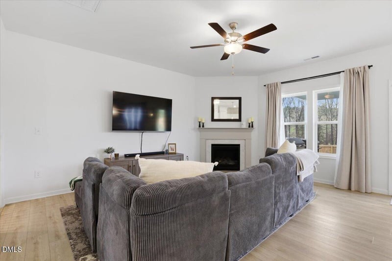 Inside, the McClean II plan welcomes you with upgraded LVP flooring throughout the main living areas and no carpet on the main level, making both maintenance and everyday living feel easy. The open layout is warm and inviting, with a living room centered around a gas log fireplace with a white marble surround, ready for cozy nights ahead.