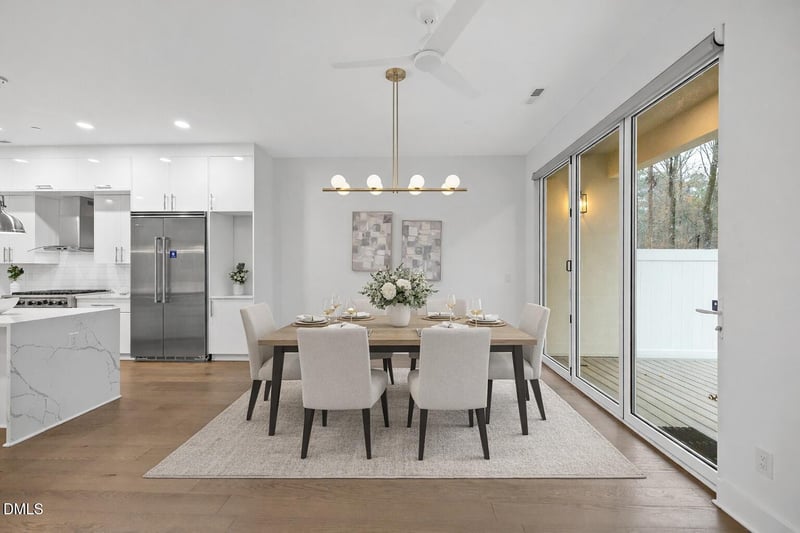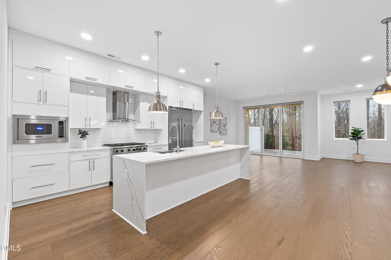 Listing details for 4007 Southpoint Landing Way, Durham, NC 27707 : Designed for modern luxury living, this stunning contemporary condo lives like a townhouse and is ideally located just minutes from Southpoint shopping, dining, and entertainment in. Built in 2022, the home offers a light-filled open floor plan with clean lines, soaring 10 ft ceilings on the first floor & effortless flow. The chef's kitchen is the true centerpiece, featuring an oversized waterfall island with quartz countertops, timeless subway tile backsplash, and premium Viking appliances including a 36'' gas range, refrigerator, and microwave. The kitchen opens seamlessly to the living area, where a sleek gas fireplace creates a warm focal point and sliding doors lead to a covered deck overlooking peaceful wooded views. Upstairs, a versatile loft provides flexible space ideal for a home office, media area, or fitness zone. The spacious primary suite is a private retreat with a spa-inspired bath showcasing dual vanities, a soaking tub, and a walk-in shower with built-in seating. The custom walk-in closet is exceptionally large and thoughtfully designed with built-ins and drawers. Two additional bedrooms each feature their own en suite baths, offering comfort and privacy for guests or family, while one bedroom includes access to a private balcony. Enjoy the community amenities including a pool, clubhouse with fitness center, dog park, and EV charging stations. Conveniently located with easy access to I-40, RDU Airport, RTP, and all that the Triangle has to offer, this home combines low-maintenance living with high-end design and an unbeatable location. Don't miss out on all this one has to offer! ***Seller is paying for 6 months of HOA dues with acceptable offer.***