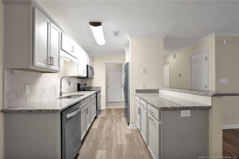 Listing details for 401 Meadowland Ct #5, Hope Mills, NC 28348 : SELLER CONCESSIONS of $4,000 with reasonable offer! Brand new HVAC! Beautifully updated 2-bedroom, 2-bath condominium offering modern comfort and low-maintenance living in a gated community close to amenities. This condominium has been completely remodeled and features granite countertops, brand new stainless steel refrigerator, range, microwave, and dishwasher, fresh paint, along with crown molding and durable LVP flooring throughout (no carpet). The open-concept layout connects the kitchen, dining area, and family room, creating an inviting space for everyday living and entertaining. The family room features a ceiling fan and a fully functioning electric fireplace, adding both comfort and ambiance. A new Security Door and tile flooring welcome you at the entry. Separate laundry room off of kitchen with washer/dryer hooks-ups is also newly tiled. Both bedrooms are generously sized with ensuite bathrooms. Step outside onto the private deck, which backs up to wooded views for added privacy. Additional storage is located just off the deck, perfect for seasonal items or outdoor gear. Thoughtfully updated and move-in ready, this condo offers style, function, and privacy in a desirable gated setting. With main-level parking access, the condo lives like a first floor unit, even though it is officially on the second floor.