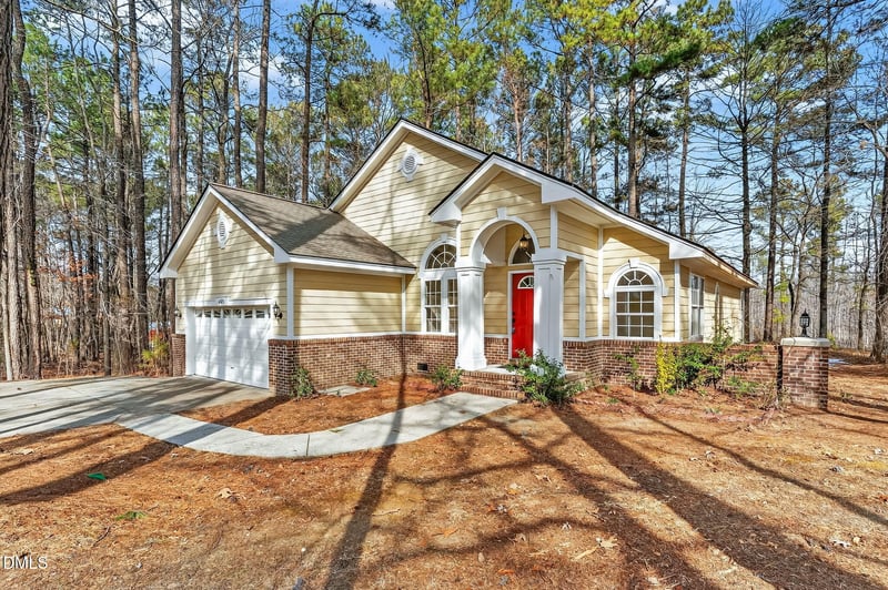 Listing details for 405 Ryans Ln, Clayton, NC 27520 : If you've been looking for a single-story home with an open floor plan that doesn't feel stacked on top of the neighbors...THIS IS IT. A smaller footprint with big-house vibes, thanks to high ceilings, built-ins, and arched architectural details that truly elevate the space. The kitchen is clean and classic with white cabinetry and generous counter space, while the roomy primary suite features an en-suite bath with a soaking tub. Additional bedrooms offer flexibility for work, hobbies, or guests. The layout flows effortlessly. Functional, stylish, and anything but boring. And the best part? You're tucked away on a large, private, wooded lot outside city limits. Must see to fully appreciate.
