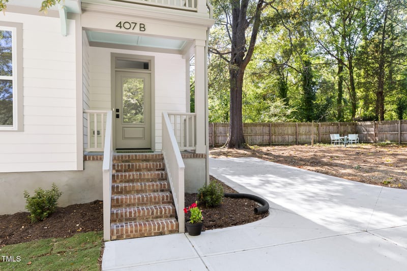 Listing details for 407b Edward St, Durham, NC 27701 : Prepare to be captivated by 407B Edward Street, a thoughtfully crafted 3-bedroom, 2-bath residence that blends modern comfort with timeless elegance. Built in 2025, this brand-new home offers the rare opportunity to be the first to own a space designed for both beauty and function. Perfectly positioned in Old North Durham, it places you just minutes from Duke University and the vibrant energy of Downtown Durham. An airy open floor plan welcomes you inside, where sunlit living and dining areas flow into a bright, inviting kitchen. Rich oak hardwood floors set the stage, complemented by quartz countertops and sleek stainless steel appliances that make both cooking and entertaining a joy. The bathrooms are equally refined, showcasing classic tile and spa-like finishes that create a retreat-like atmosphere. Upstairs, the tranquil primary suite offers a private sanctuary with its own bath, joined by two additional bedrooms and a full hall bath. For everyday convenience, an upstairs laundry is thoughtfully tucked away. Step outside to unwind on the covered patio or upper-level deck, overlooking a fenced backyard ready for gardening, play, or four-legged friends. With zoning that permits an accessory dwelling unit, the property holds exciting future potential.