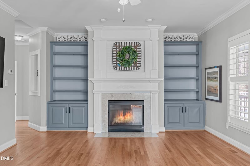 The cozy family room features a gas log fireplace framed by blue custom built in display cabinets and white custom Carolina Plantation shutters, found throughout the home. The adjoining eat in kitchen combines warmth and style with granite countertops, tile backsplash, blue cabinetry, and a sunlit breakfast nook wrapped in a bow shaped window wall.