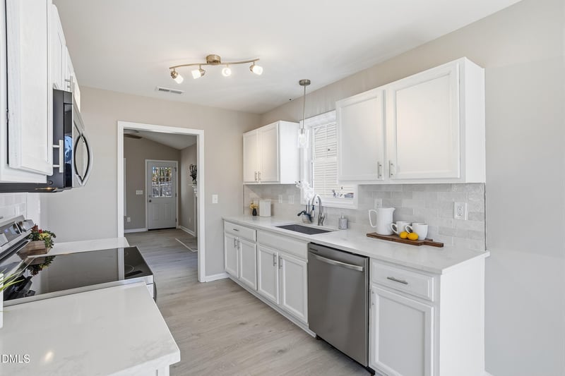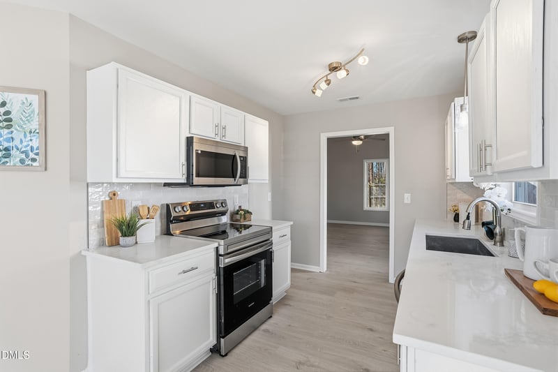 Listing details for 4100 Mindspring Dr, Raleigh, NC 27610 : Updated ranch home offering comfort and modern style! The kitchen features new quartz countertops and stainless steel appliances, perfect for everyday living and entertaining. New engineered hardwood floors flow throughout the main living areas, while brand-new carpet adds warmth to the bedrooms. The bathrooms have been tastefully updated with tile flooring and quartz vanities, creating a clean and contemporary feel. This move-in-ready home combines thoughtful upgrades with easy, single-level living.