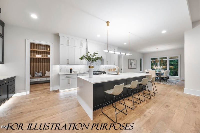 Listing details for 4111 Laurel Ridge Dr, Raleigh, NC 27612 : This exceptional presale opportunity presents a contemporary luxury build by Wilks Builders. Situated on a private 0.85-acre homesite, the property offers an expansive canvas perfectly suited to accommodate a future pool and a private backyard oasis! Complemented by a three-car garage for ample parking space. This home seamlessly blends sophisticated architecture with functional elegance! The main level serves as the heart of the home, with a gourmet kitchen that offers a quartz island with a waterfall edge, custom painted cabinetry with gold accent pulls and vertical ornate tile backsplash. The Thermador appliance package includes a six-burner gas range with griddle, microwave drawer and a built-in refrigerator with a cabinet panel. A massive scullery and a dedicated wet bar area with floating shelves and a wine cooler ensure seamless entertaining! The first floor features a guest suite and a private study, along with a breathtaking owner's suite that features slat wood trim paneling, rich hardwoods and a four-panel slider leading to a private screened porch. The spa-style bath boasts a floating dual vanity with quartz top, a freestanding tub and a huge zero-entry shower with dual entry. The massive walk-in closet is meticulously organized with his and her sides to meet every storage need! In the family room, a tile-to-ceiling surround frames a linear fireplace, flanked by custom built-in cabinets and shelving. Large sliding doors open to the rear porch, which is equipped with phantom screens and a stone-to-ceiling double-sided linear fireplace for year-round enjoyment! The upper level with secondary en suites, a spacious loft and a recreational room complete with its own wet bar and half bath and finished storage space adds to the home's practicality! This energy-efficient home combines a five-bedroom, six-bathroom floor plan with high-end finishes and modern technology. Discover the pinnacle of contemporary living in a location that offers both privacy and proximity to the very best of the Triangle!