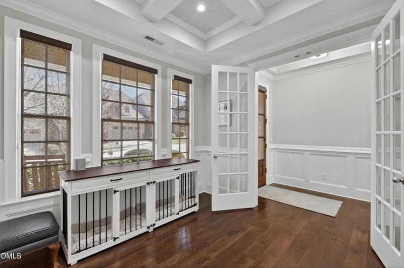 Listing details for 4167 English Garden Way, Raleigh, NC 27612 : Welcome to 4167 English Garden Way, an Ashton Woods model home designed for comfort, flexibility, and low-maintenance living in Glenlake South Cottages. This home offers a first-floor primary suite, featuring 10-foot ceilings on main level, a walk-in closet, and a full bath with an oversized shower. Everyday living is easy on the main level, which also includes a formal study, laundry room, hardwood floors, and a bright great room with custom built-ins and mantel. The kitchen offers 42' maple cabinetry, quartz countertops, a granite island, and a walk-in pantry. Recent updates include a new refrigerator, washer and dryer, and new HVAC (2025). Other features include a tankless water heater, LED lighting with Lutron dimmers, and an epoxy-finished garage floor. Upstairs, a spacious loft creates flexible living space which can be ideal for a home office or bonus room, along with additional unfinished attic storage. Outdoor living is enhanced by a paver patio, fenced backyard, gas grill line, outdoor lighting, drip irrigation, and retractable awning. Energy-efficient features include a solar system and Tesla Powerwall battery backup, helping keep monthly utility costs exceptionally low. Sidewalk-lined streets, proximity to the hospital and art museum, and community-provided exterior and landscape maintenance complete the appeal of this upgraded home.