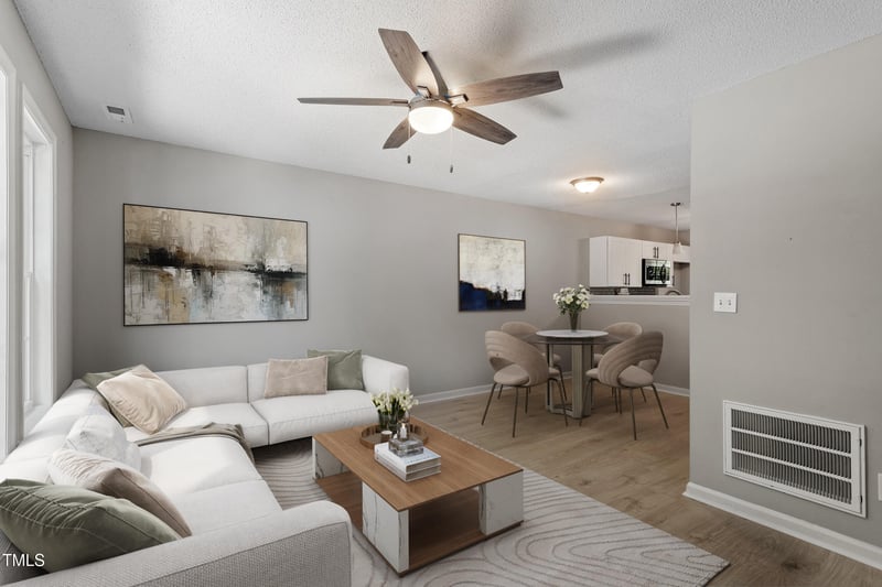 Listing details for 4242 Kaplan Dr, Raleigh, NC 27606 : Adorable 2 bedroom Townhouse in Prime Raleigh location - minutes from Downtown Raleigh and NC State campus. Bright open custom kitchen features new shaker cabinets, granite counters, tile backsplash and stainless steel appliances. Wide plank laminate hardwood flooring through main living areas; PLUSH new carpet. New water heater 2025. Staged photos for illustration only, to show homes potential.